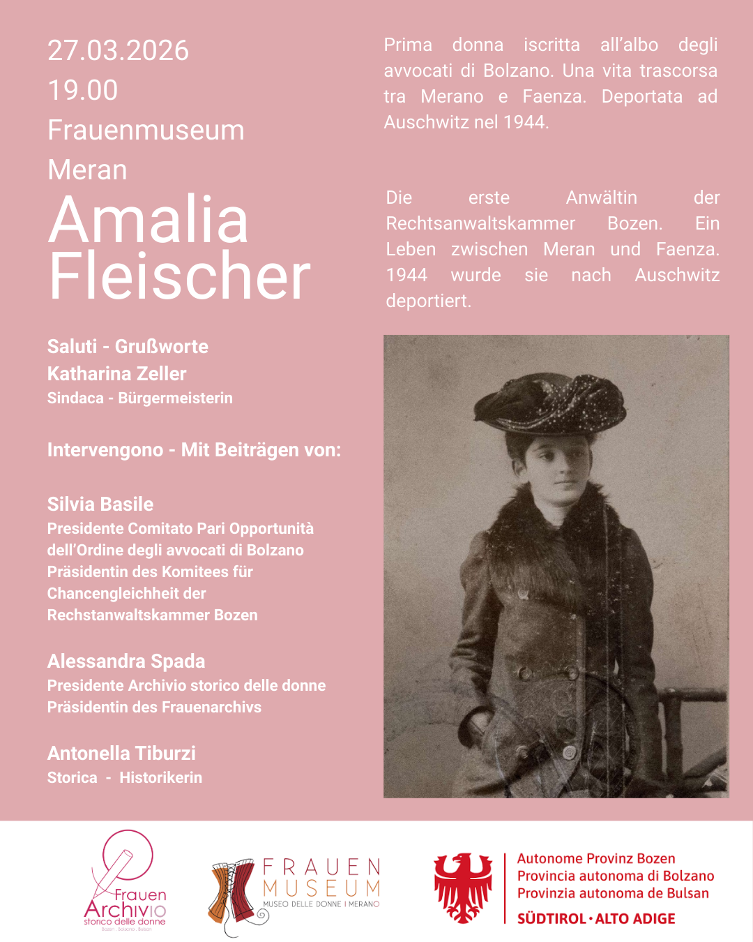 Silvia Basile, Präsidentin des Komitees für Chancengleichheit der Rechtsanwaltskammer Bozen, Alessandra Spada, Präsidentin des Frauenarchivs Bozen, und Antonella Tiburzi, Historikerin, halten einen Vortrag über das aufregende Leben von Amalia Fleischer, ihr Leben in Meran und Faenza bis zu ihrer Deportation nach Auschwitz-Birkenau.